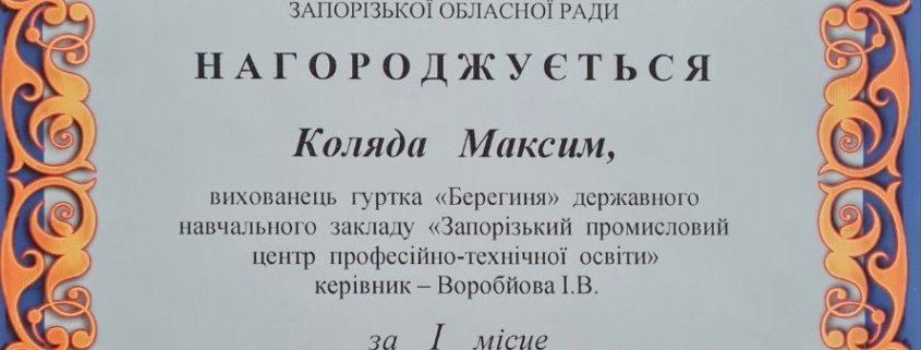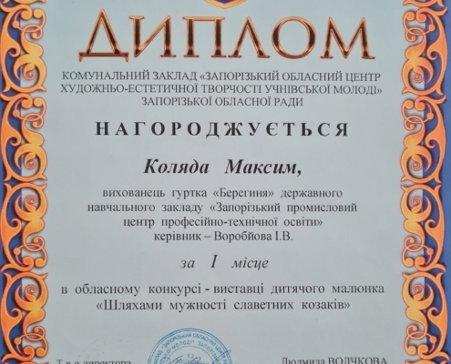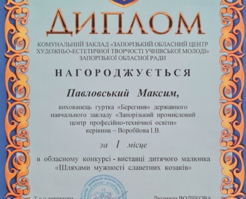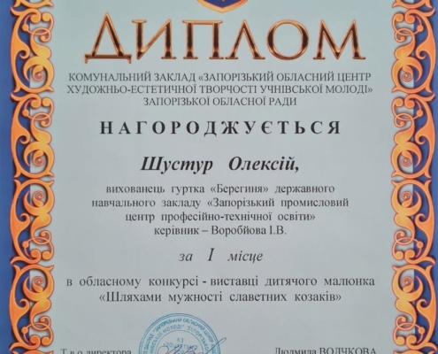 Високою майстерністю, творчою індивідуальністю вразили журі авторські роботи здобувачів освіти ДНЗ «Запорізький промисловий ЦПТО», які були надані на участь в обласному конкурсі-виставки дитячого малюнку «Шляхами мужності славетних козаків». Також обласне журі відзначило позитивні тенденції формування у молоді патріотичних почуттів до рідного краю. На підставі рішення журі обласного конкурсу посіли призові місця та були нагороджені дипломами: