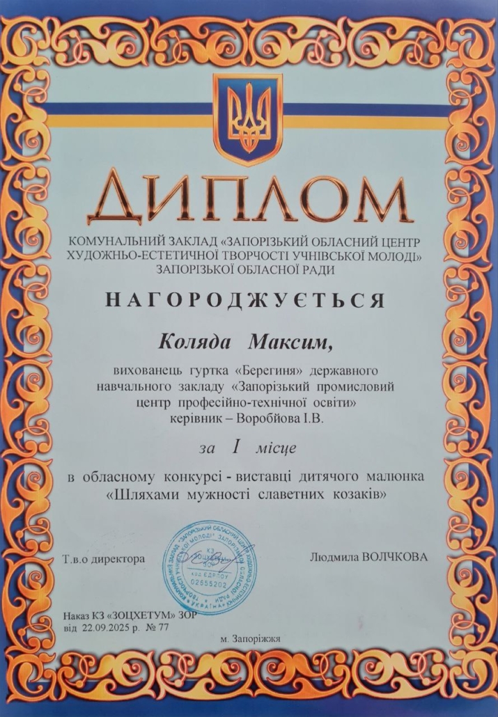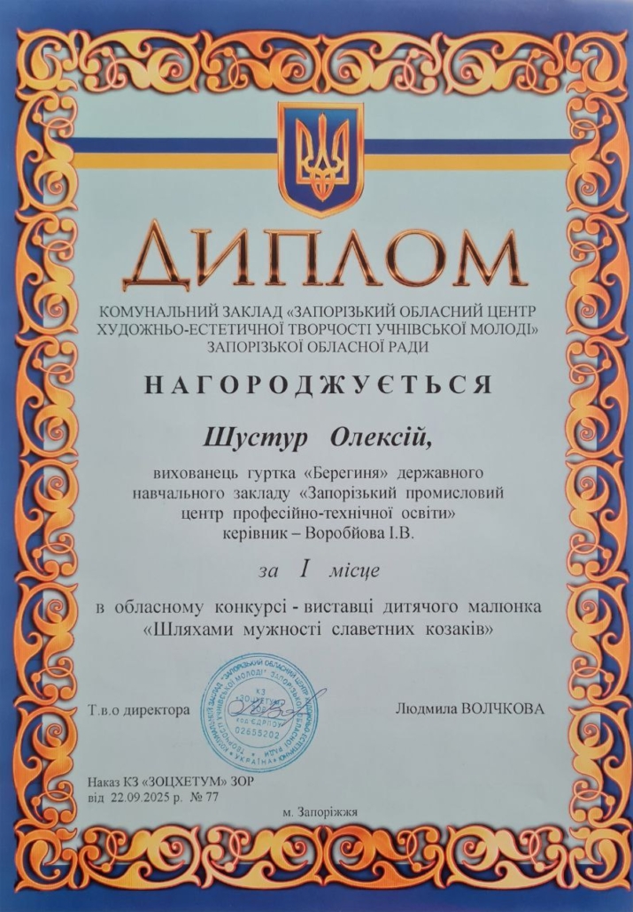 Високою майстерністю, творчою індивідуальністю вразили журі авторські роботи здобувачів освіти ДНЗ «Запорізький промисловий ЦПТО», які були надані на участь в обласному конкурсі-виставки дитячого малюнку «Шляхами мужності славетних козаків». Також обласне журі відзначило позитивні тенденції формування у молоді патріотичних почуттів до рідного краю. На підставі рішення журі обласного конкурсу посіли призові місця та були нагороджені дипломами: