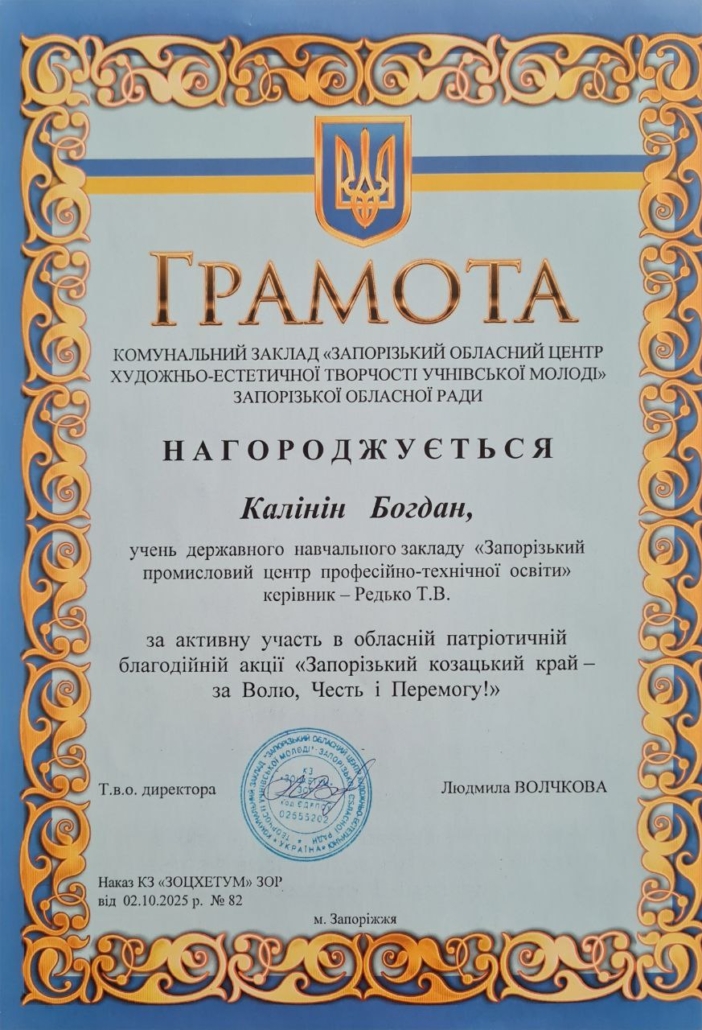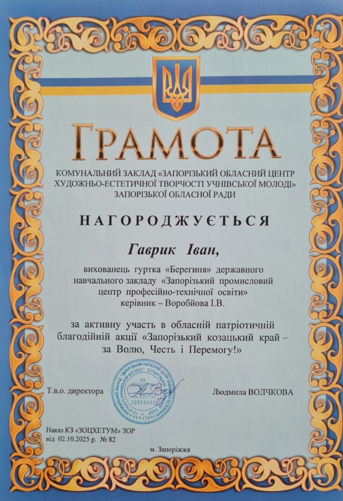 Здобувачі освіти ДНЗ «Запорізький промисловий ЦПТО» долучились до участі в обласній патріотичній благодійній акції «Запорізький козацький край – за Волю, Честь і Перемогу!».